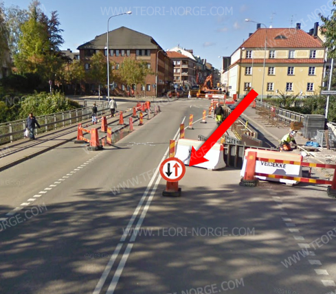 ويكون الطريق ضيق وتوضع شاخصة مرورية محمولة توضح لمن افضلية المرور حسب المكان وطبيعة الطريق وهذا مثال