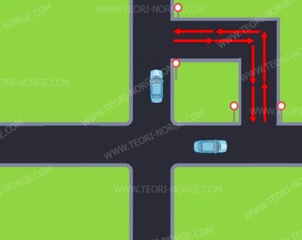 بينما السيارة عند السهم الأحمر لا يسمح بدخول الطريق هذا ويسمح لها بالأستمرار للأمام او لليمين فقط